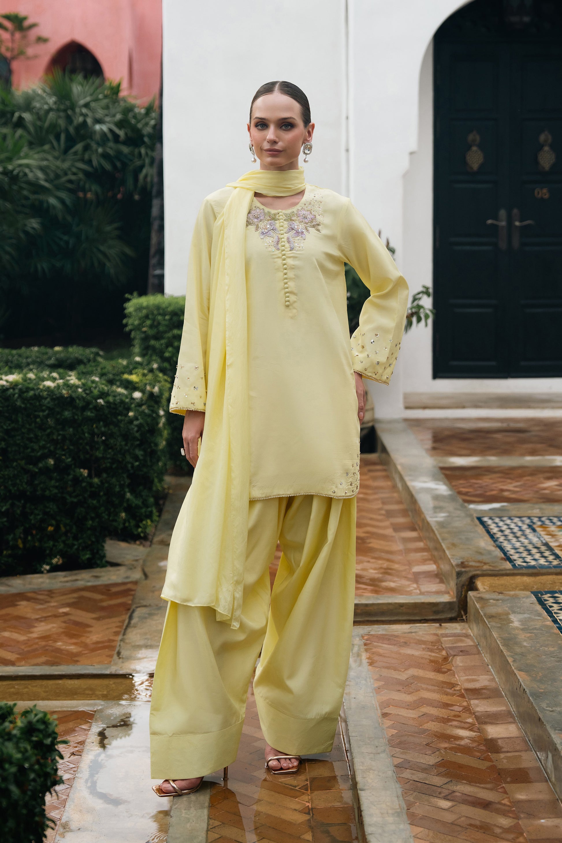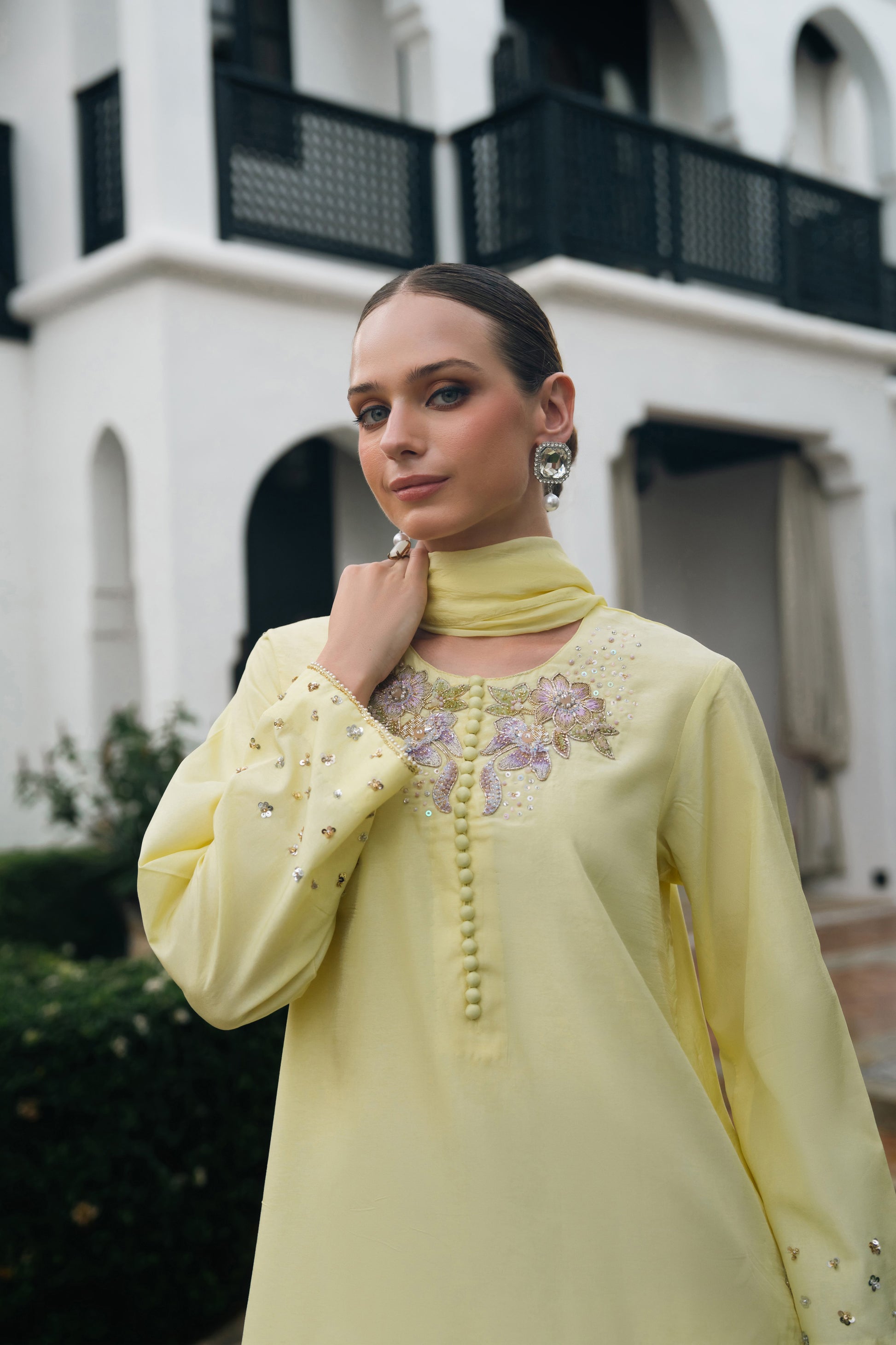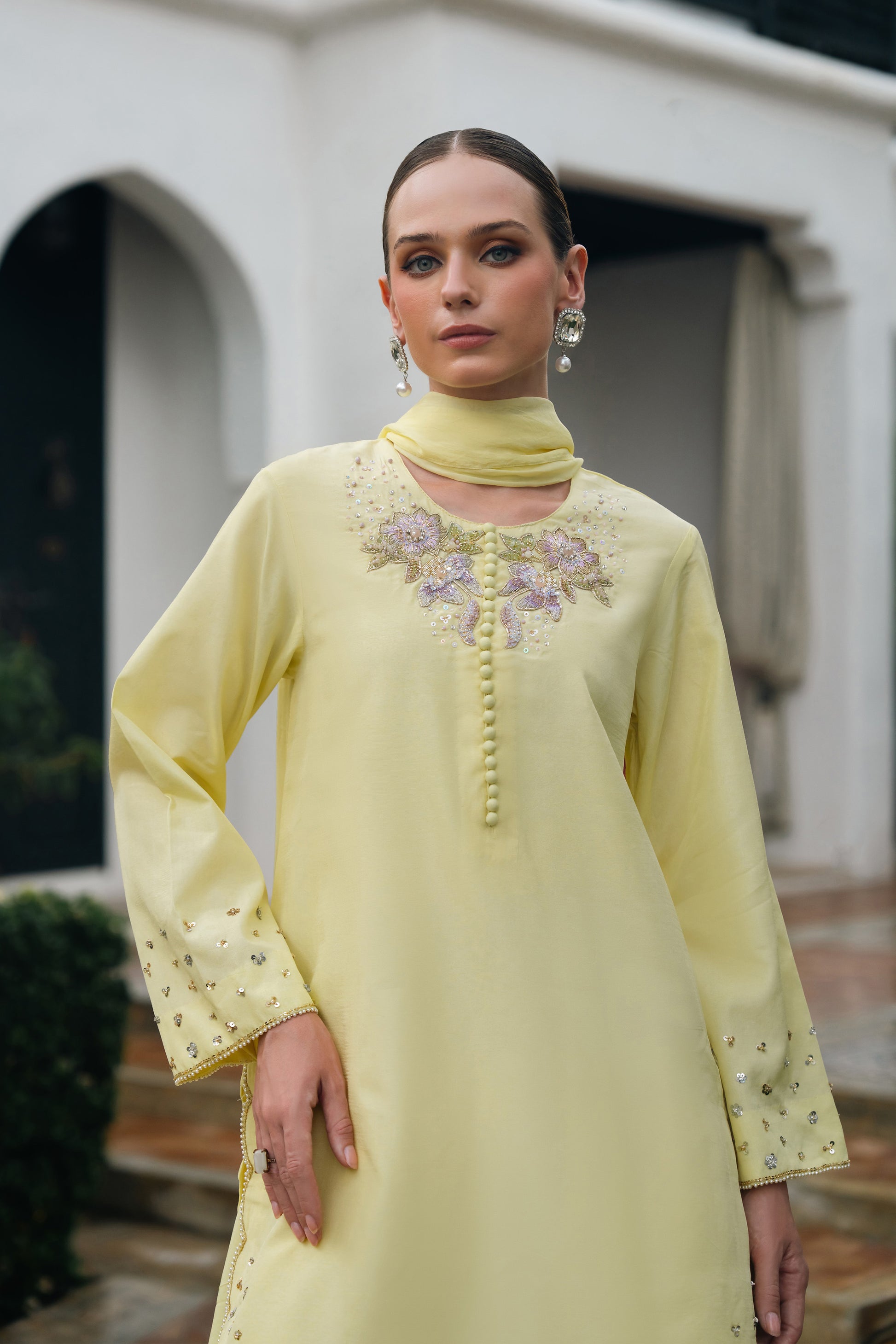 Radiating effortless elegance, this soft yellow ensemble captures the essence of refined femininity. The front features intricate hand embellished floral motifs delicately crafted with pearls, sequins, and cut beads for a timelessly graceful look. The subtle shimmer and 3D detailing add just the right amount of sparkle, perfect for daytime festivities or intimate soirées.The sleeves are beautifully adorned with scattered floral sequins and finished with a fine pearl-edged border, while the hemline features a scalloped finish enhanced with dainty handwork adding movement and charm to the silhouette.