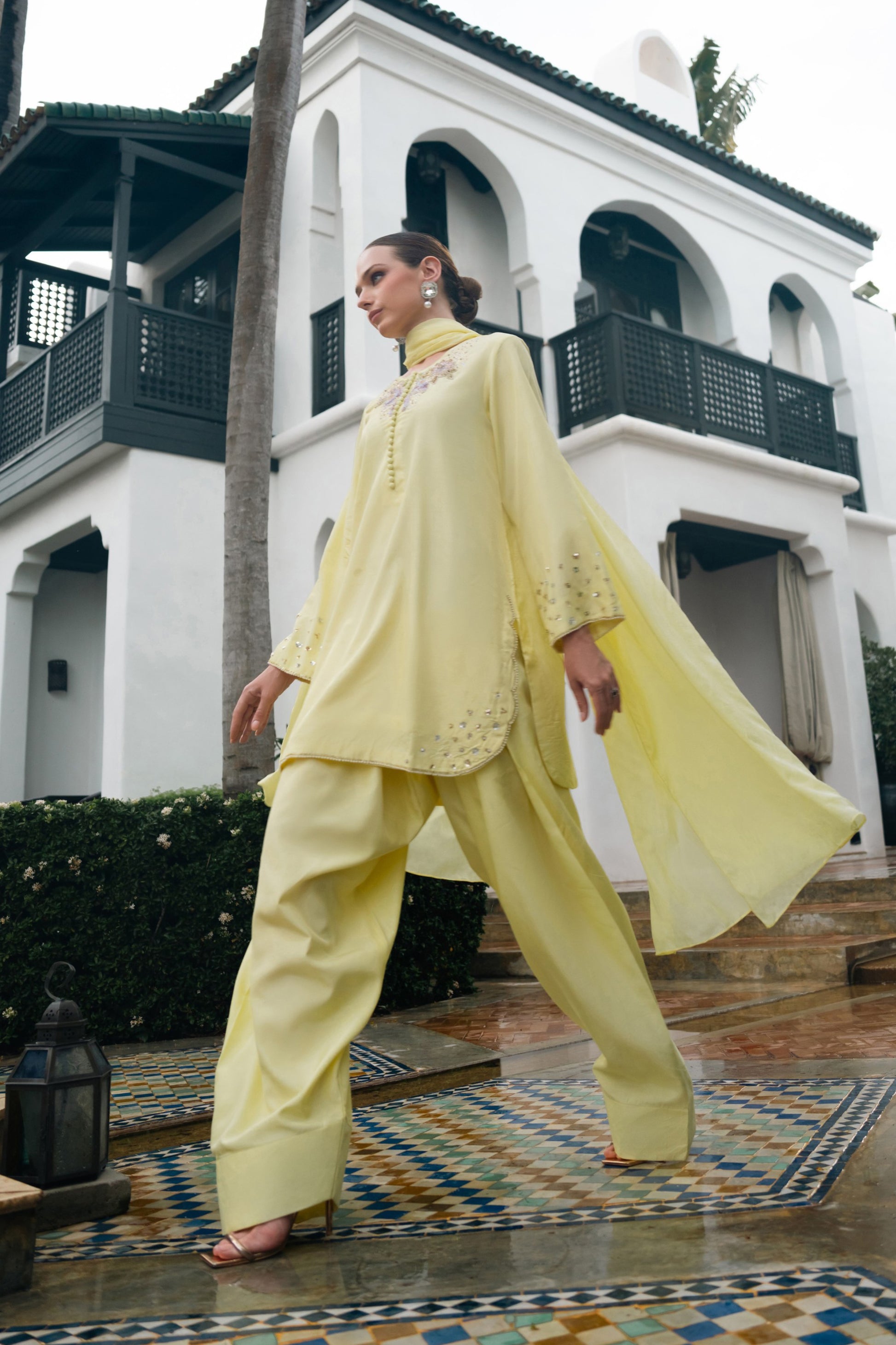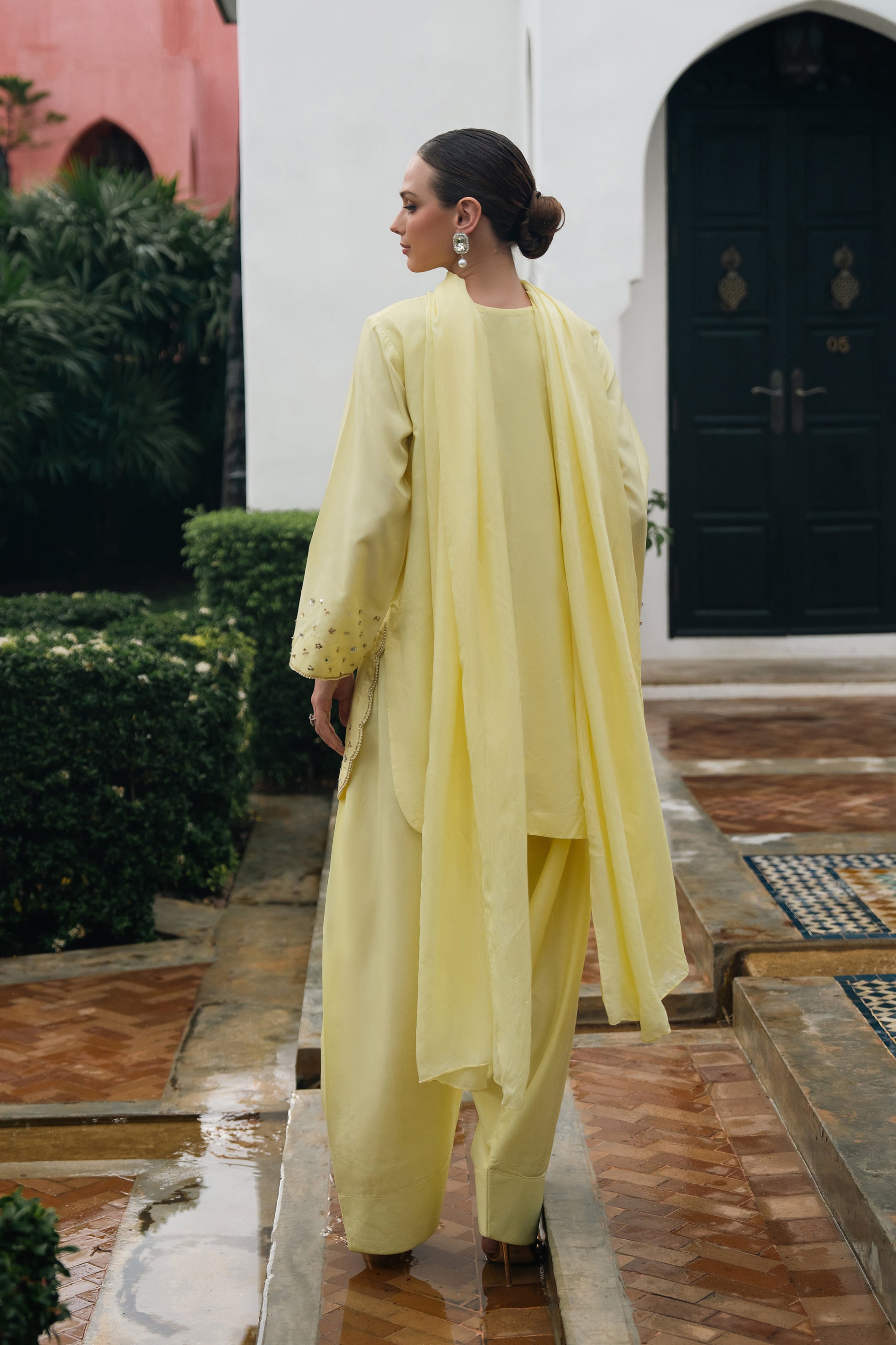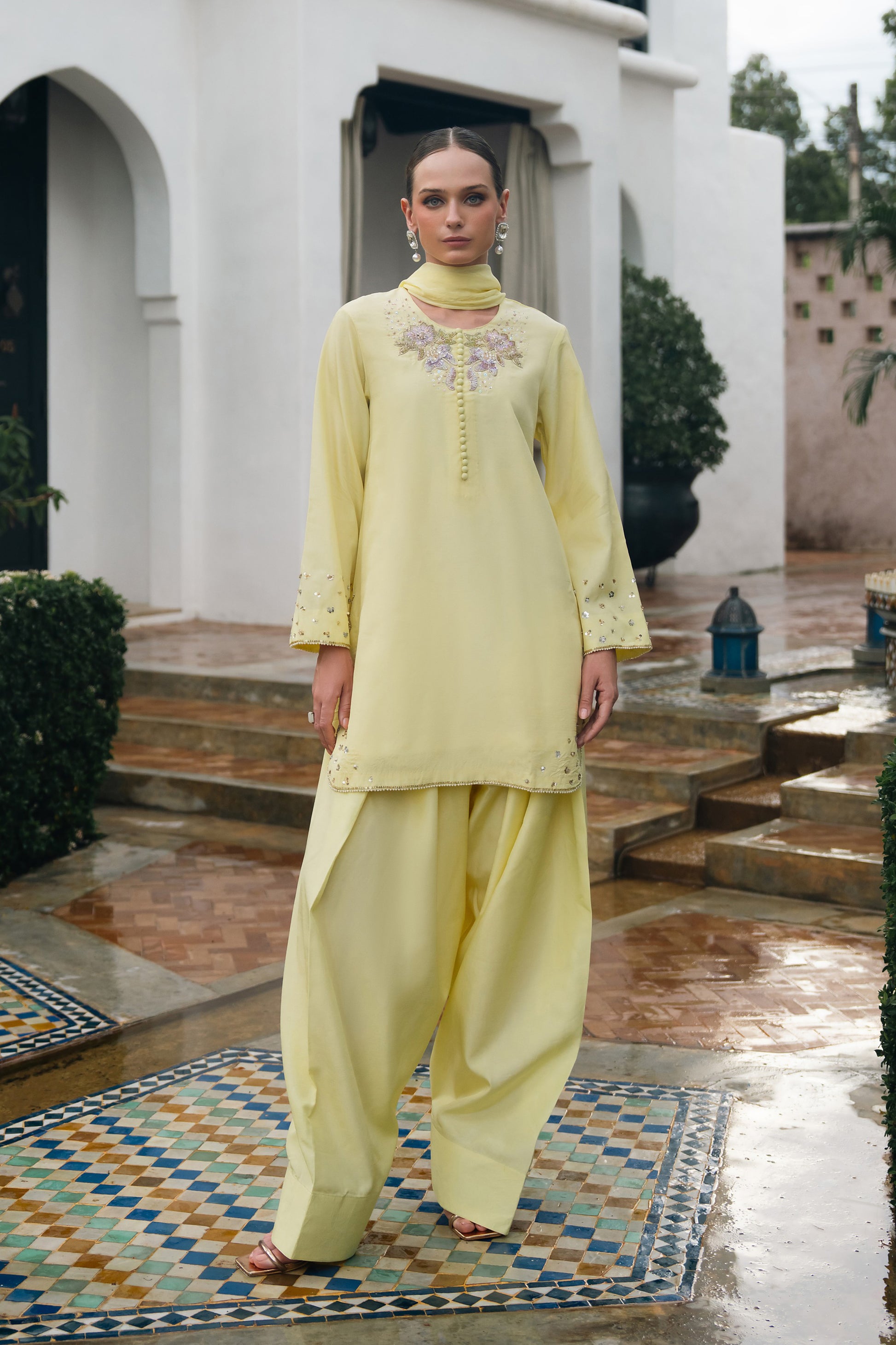 Radiating effortless elegance, this soft yellow ensemble captures the essence of refined femininity. The front features intricate hand embellished floral motifs delicately crafted with pearls, sequins, and cut beads for a timelessly graceful look. The subtle shimmer and 3D detailing add just the right amount of sparkle, perfect for daytime festivities or intimate soirées.The sleeves are beautifully adorned with scattered floral sequins and finished with a fine pearl-edged border, while the hemline features a scalloped finish enhanced with dainty handwork adding movement and charm to the silhouette.