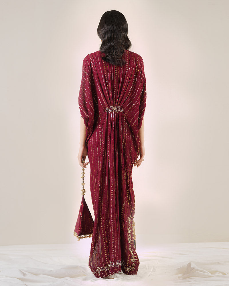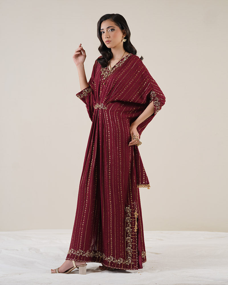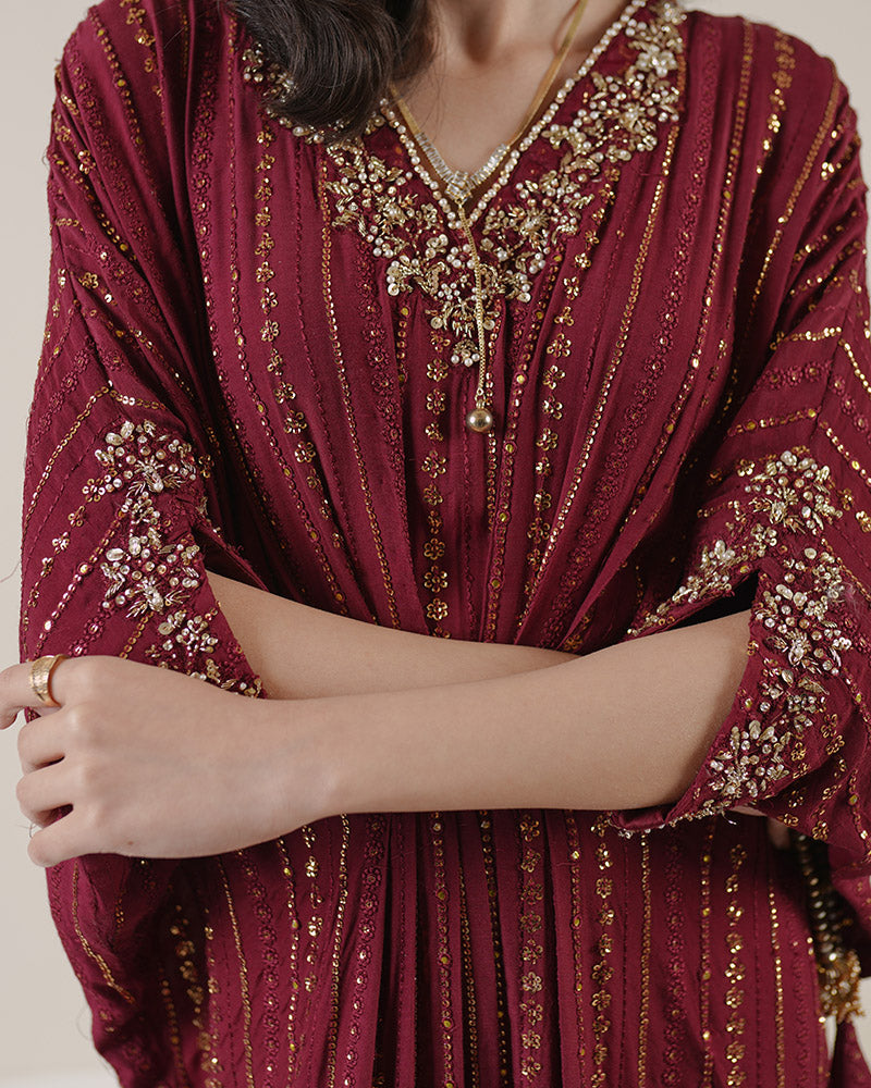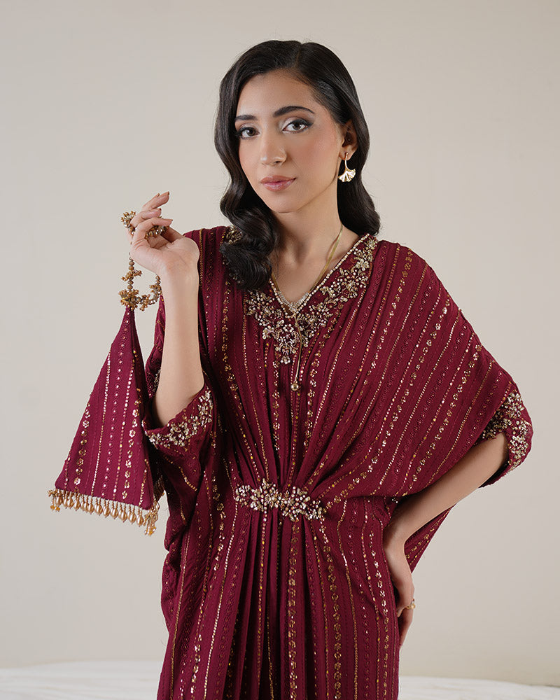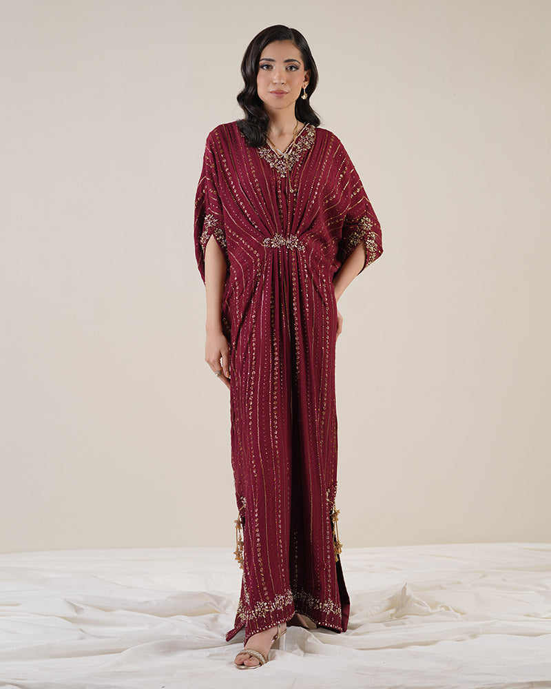 This elegant kaftan is crafted from raw silk with a relaxed cut, short side slits, and a V neckline. It features detailed hand embellishments with dabka, kora, pearls, beads, sequins, cut dana, and crystals. Satin silk finishes the hems, while gotta and crystal tassels at the side slits add a touch of festive flair. A perfect blend of tradition and modern glam.