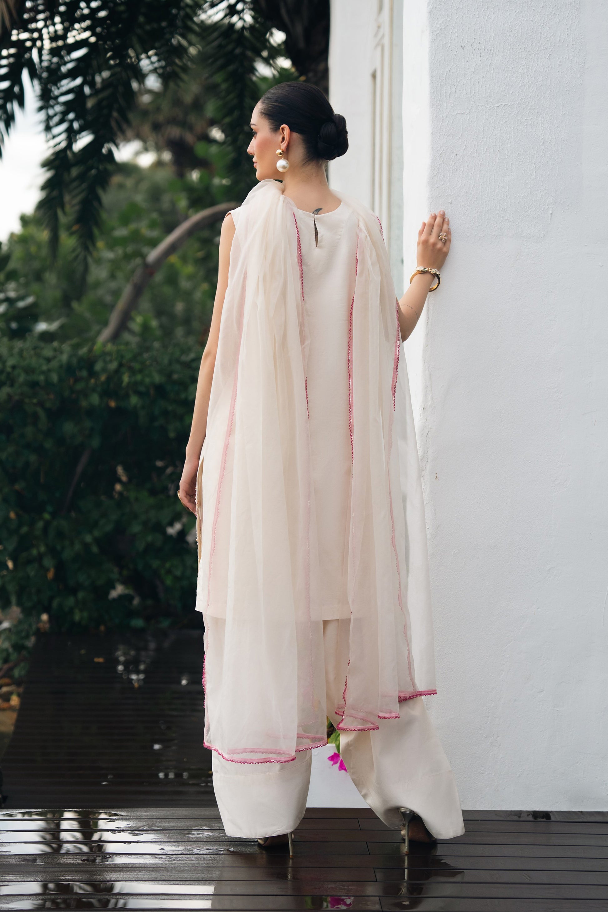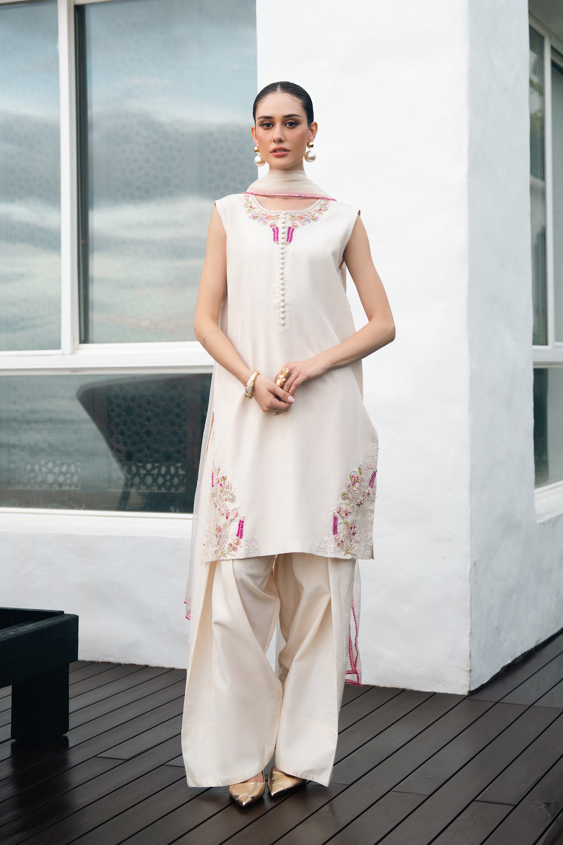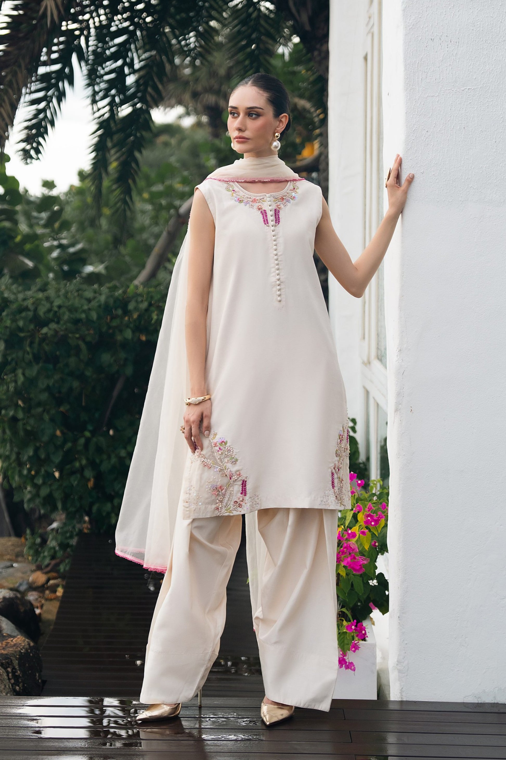Stitching details: Shirt style: A short-length, straight, sleeveless shirt, fused with premium net fusing, featuring a round neckline, a back neck opening, and a patched organza detail at the hem.Trouser style: plain dyed farshi shalwar fused with premium net fusing.Dupatta finishing: A beautiful beige organza dupatta, finished with a very delicate fuchsia colored beaded lace.