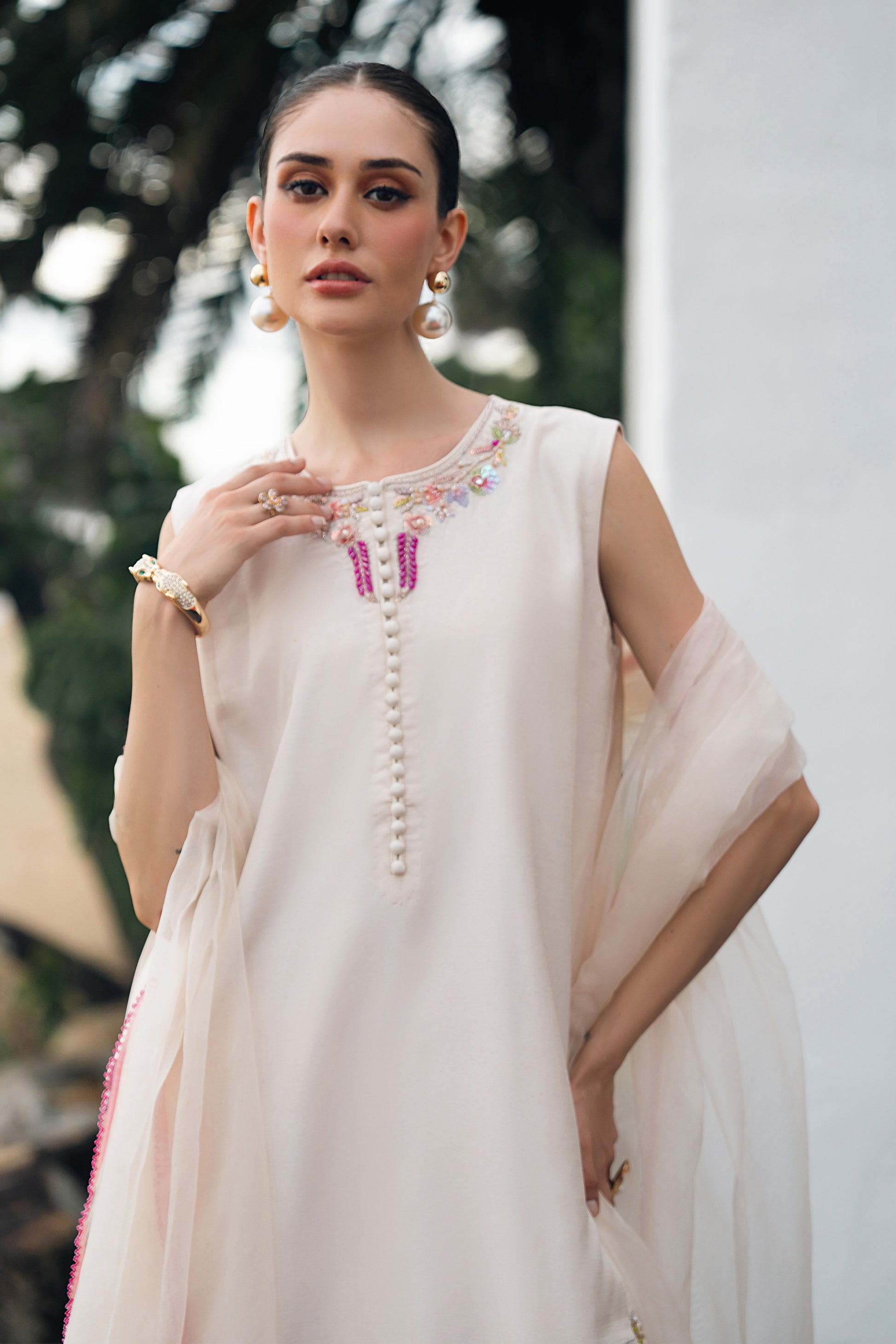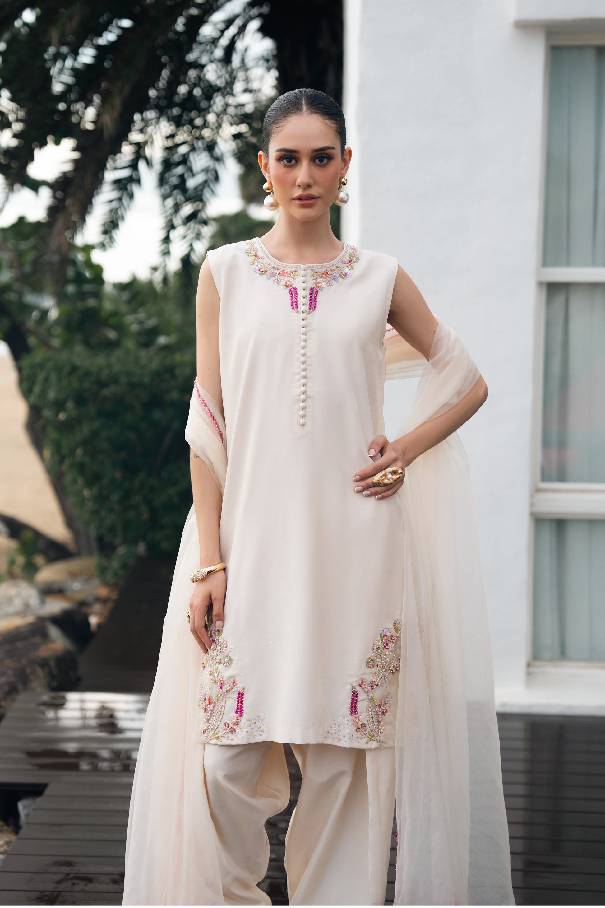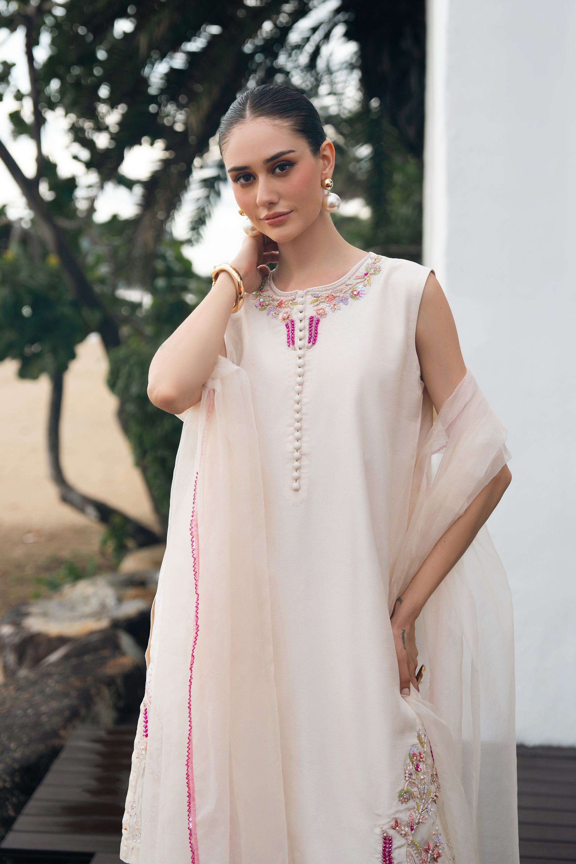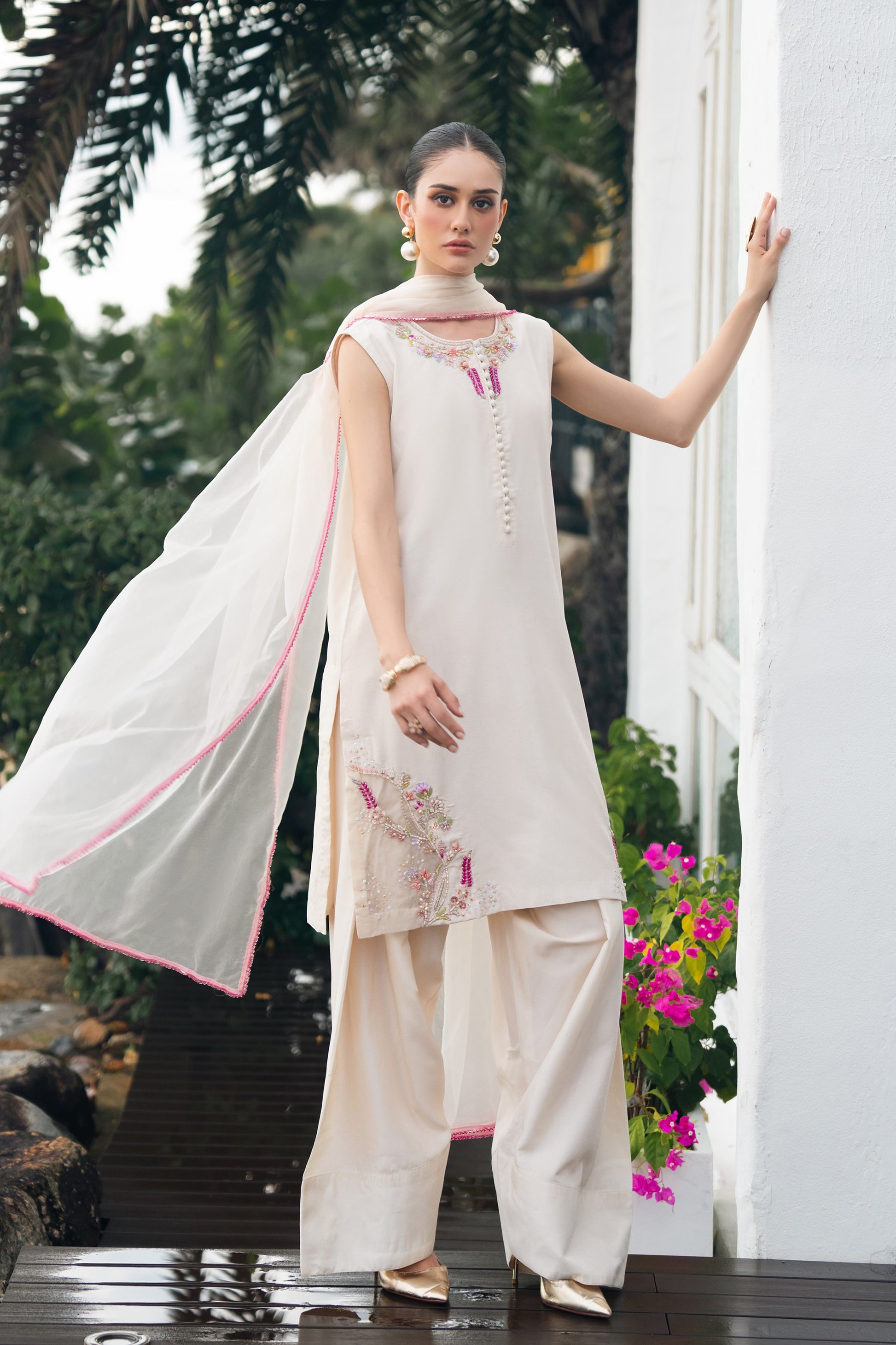 Stitching details: Shirt style: A short-length, straight, sleeveless shirt, fused with premium net fusing, featuring a round neckline, a back neck opening, and a patched organza detail at the hem.Trouser style: plain dyed farshi shalwar fused with premium net fusing.Dupatta finishing: A beautiful beige organza dupatta, finished with a very delicate fuchsia colored beaded lace.