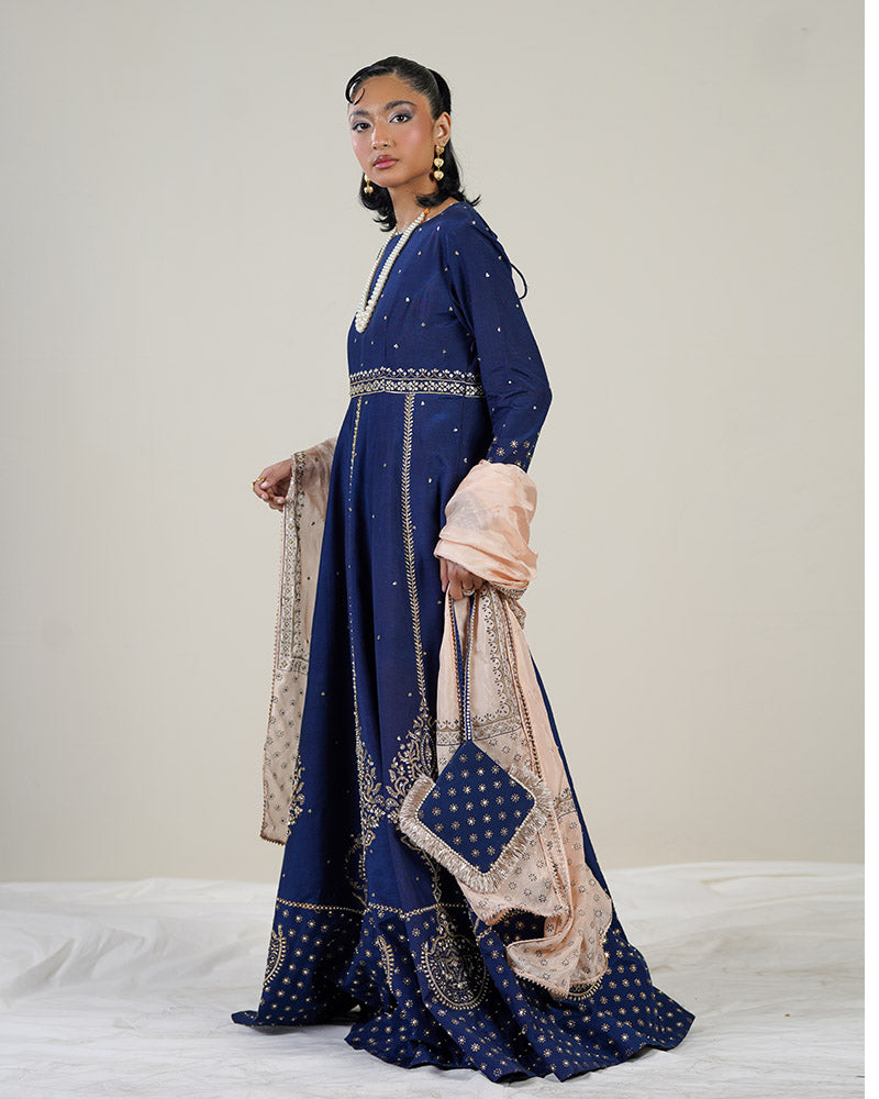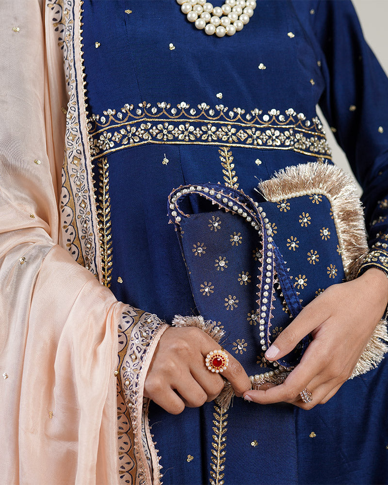 This blue pishwas is made from premium tussel silk with cotton silk lining, featuring a round front and deep back neckline with fitted sleeves. It’s block-printed and richly hand-embellished with gotta dori, sheesha work, dabka, kora, pearls, and sequins. Embellished tassels finish the sleeves and back. Paired with raw silk cigarette pants and a medium silk dupatta detailed with block print, embellishments, and gotta lace.